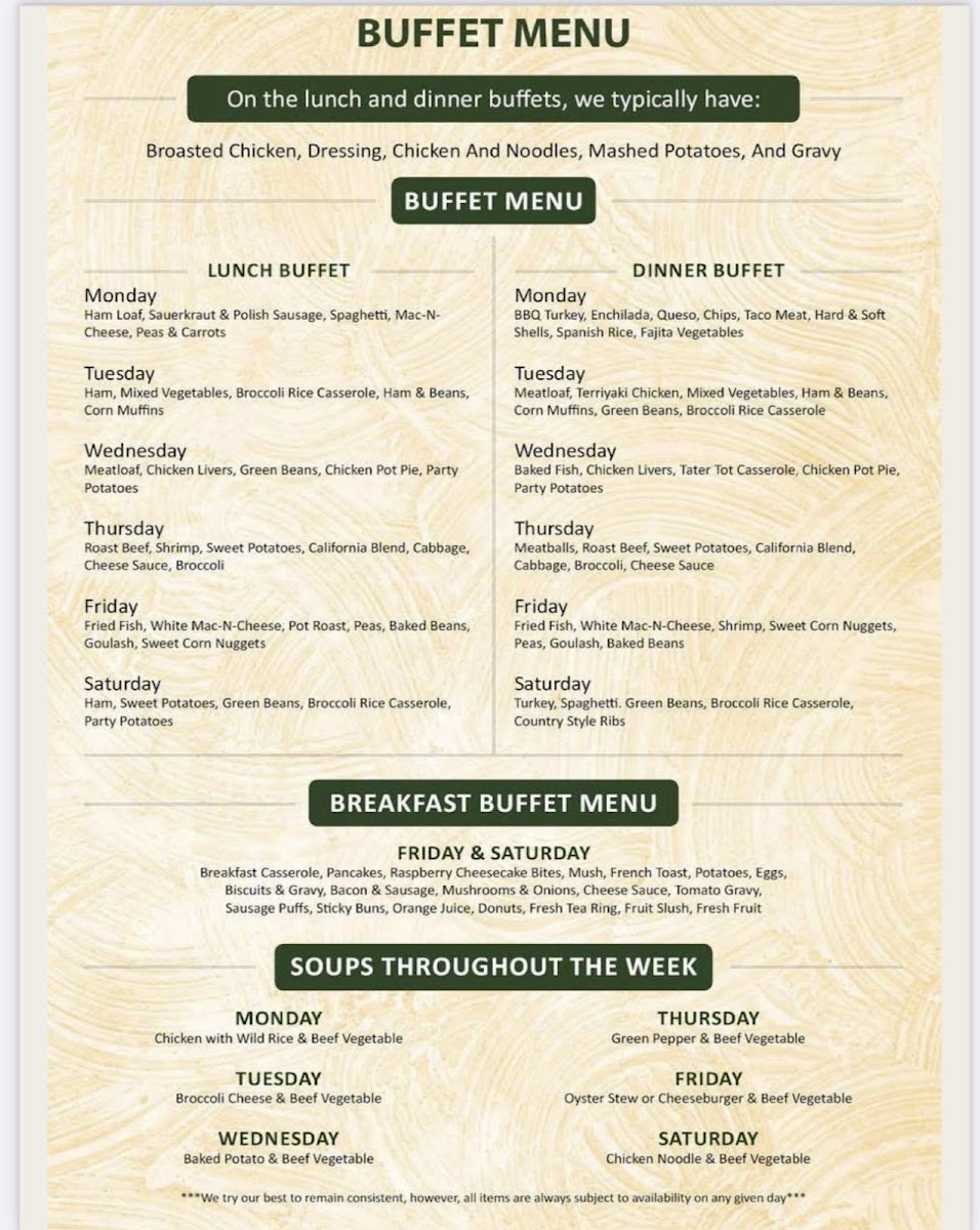 The overall experience is one of ease and comfort, where the food blends well with a friendly, down-to-earth setting. Whether choosing from the buffet or ordering a plated dinner, the menu supports an everyday kind of joy found in simple but satisfying flavors.